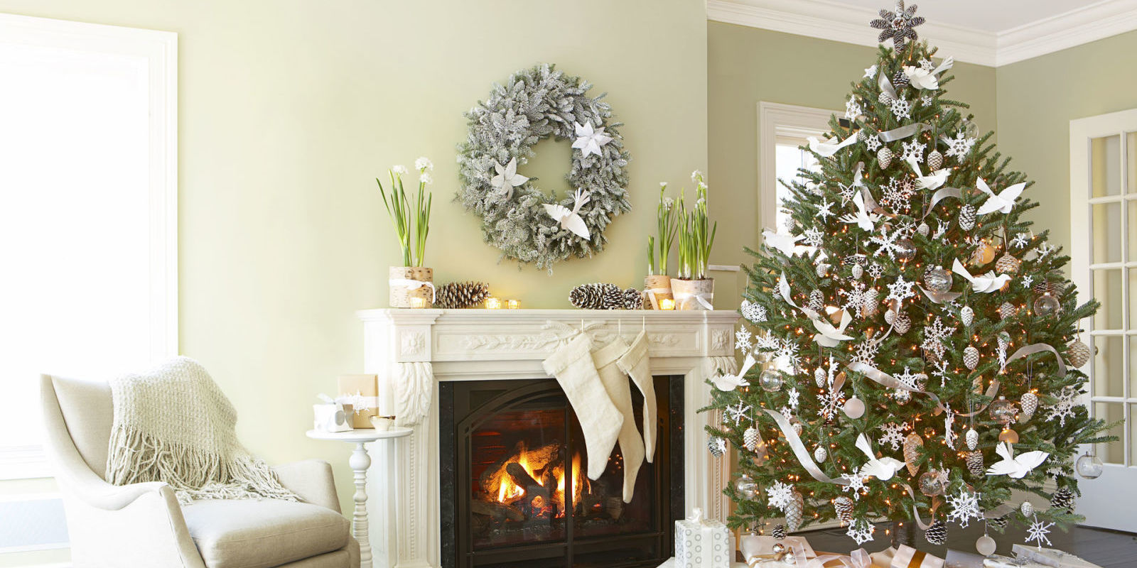 - Ёлка украшена в светлой цветовой гамме с использованием эксклюзивного стеклянного декора и шишек